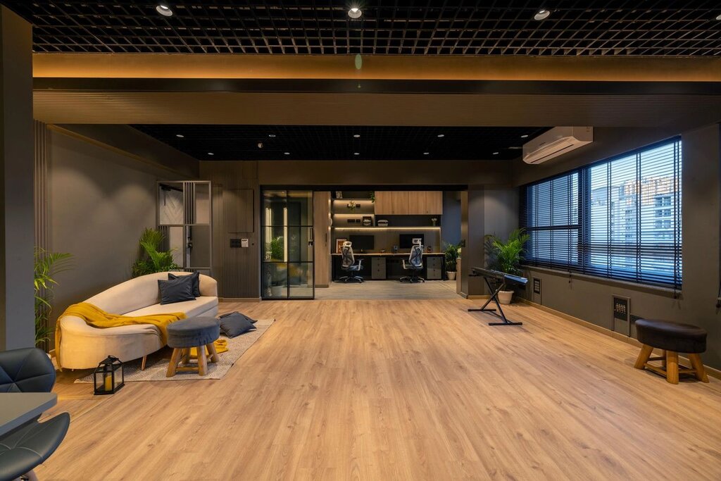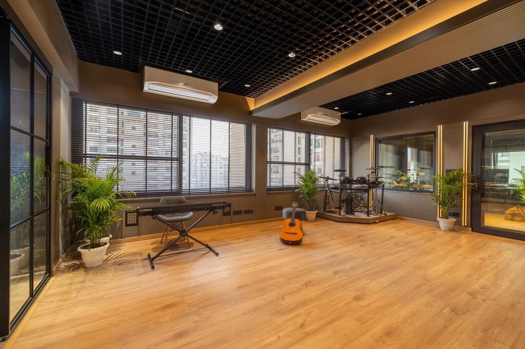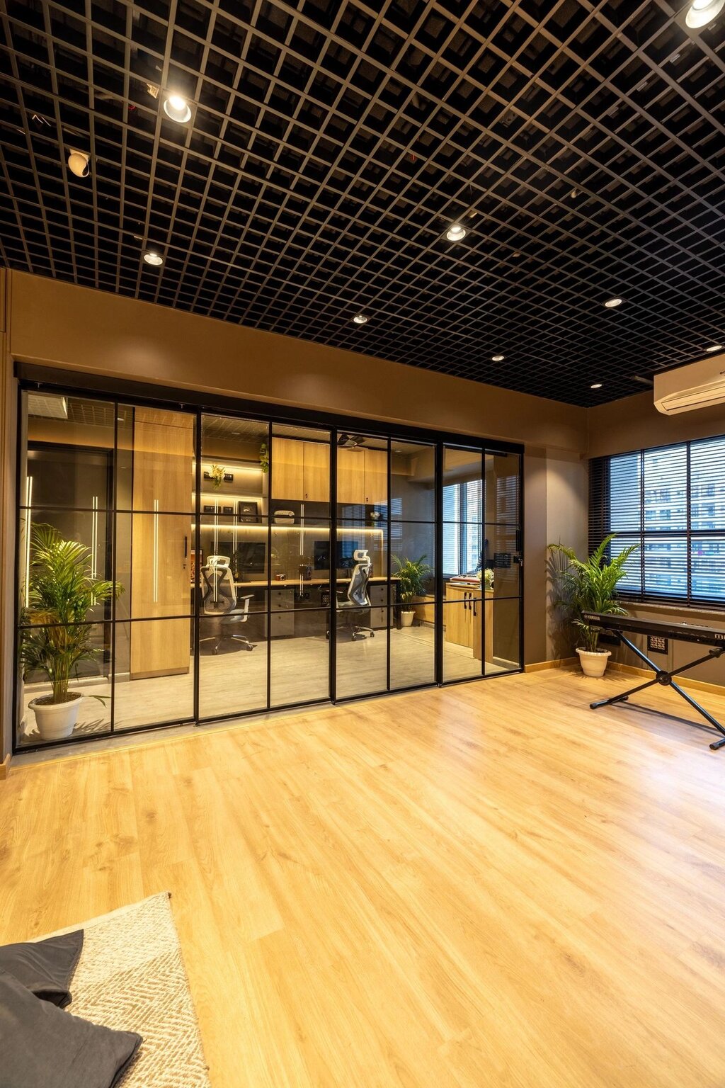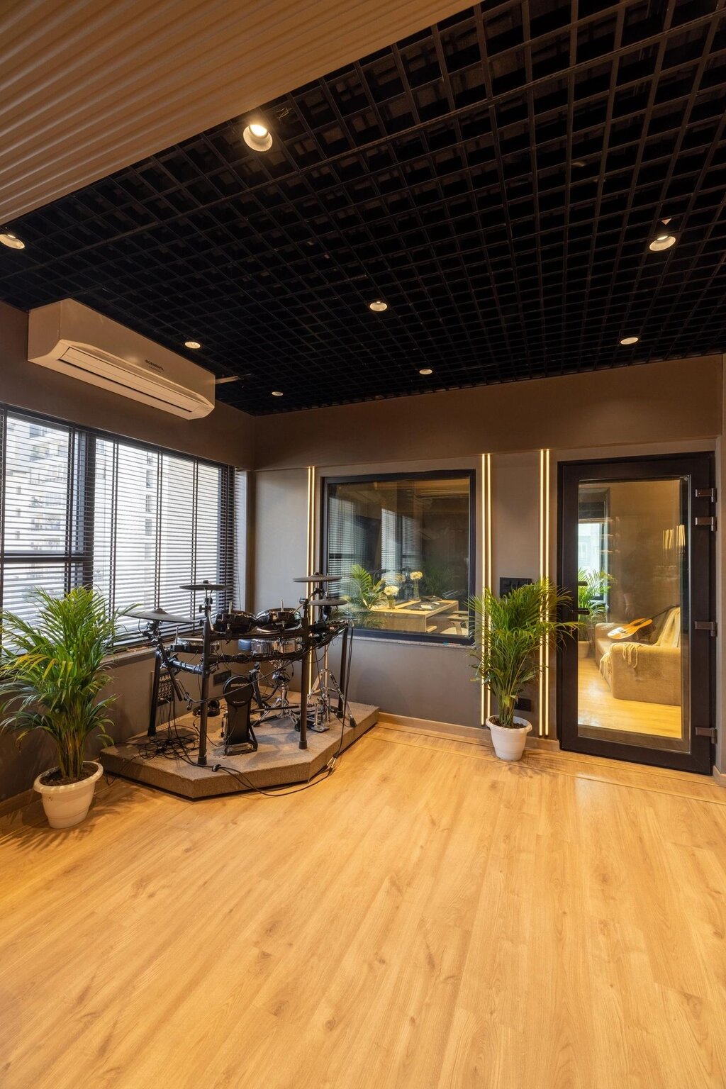 In contrast to the typical corporate studio design, this space embraces a relaxed, informal zoning. A black aluminum ceiling grid and oakwood flooring ground the design, while hidden cable trays prevent the chaos of wires from interfering with jam sessions. Diffused lighting adds an ethereal glow, creating an ideal backdrop for performances, live broadcasts, and recording sessions. The pantry, tucked away behind full-length blinds, ensures seamless integration, while wooden blinds in the meeting room absorb stray noise, maintaining the studio’s serenity.