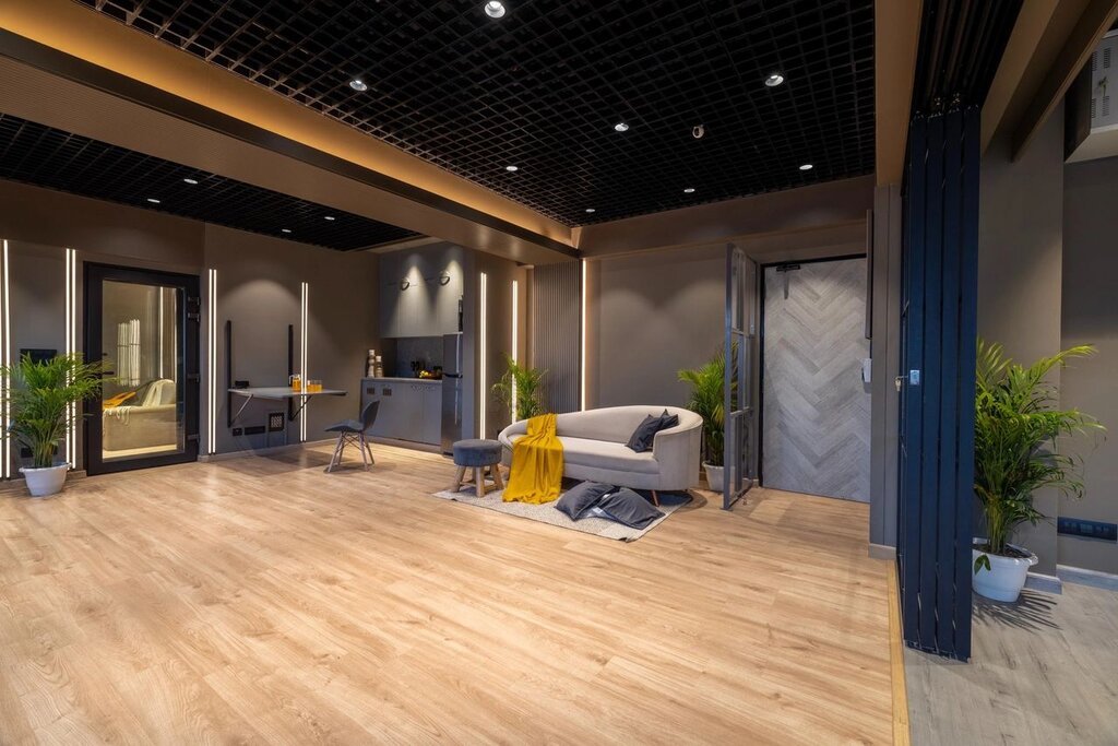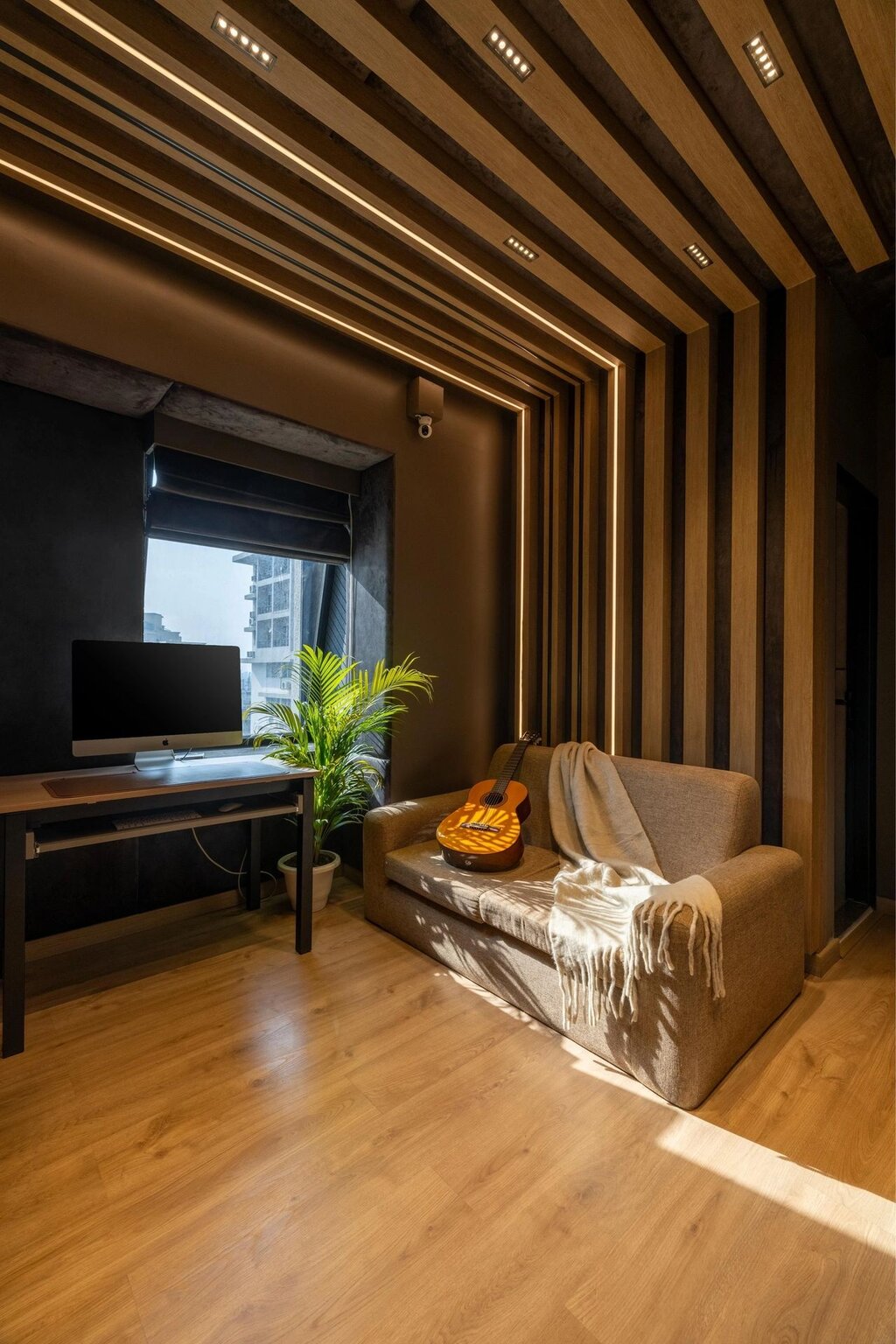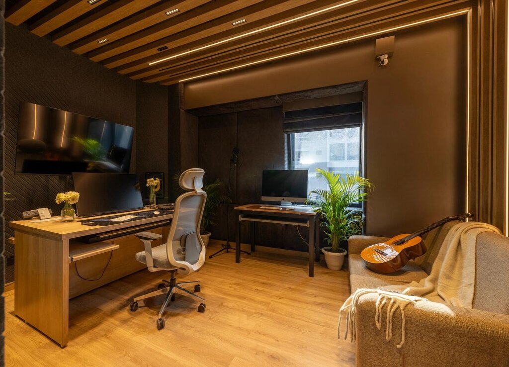 Framed by a rich, deep charcoal hue with wooden accents, Twinstrings’ studio seamlessly blends cutting-edge sound engineering with bold design, creating the ultimate creative haven.