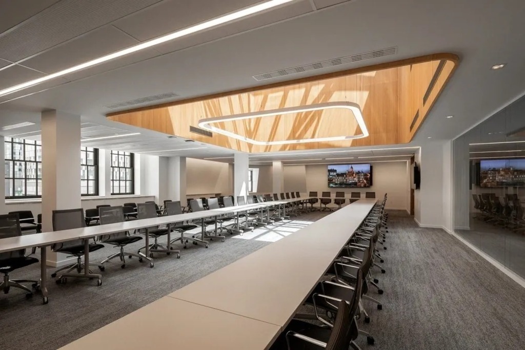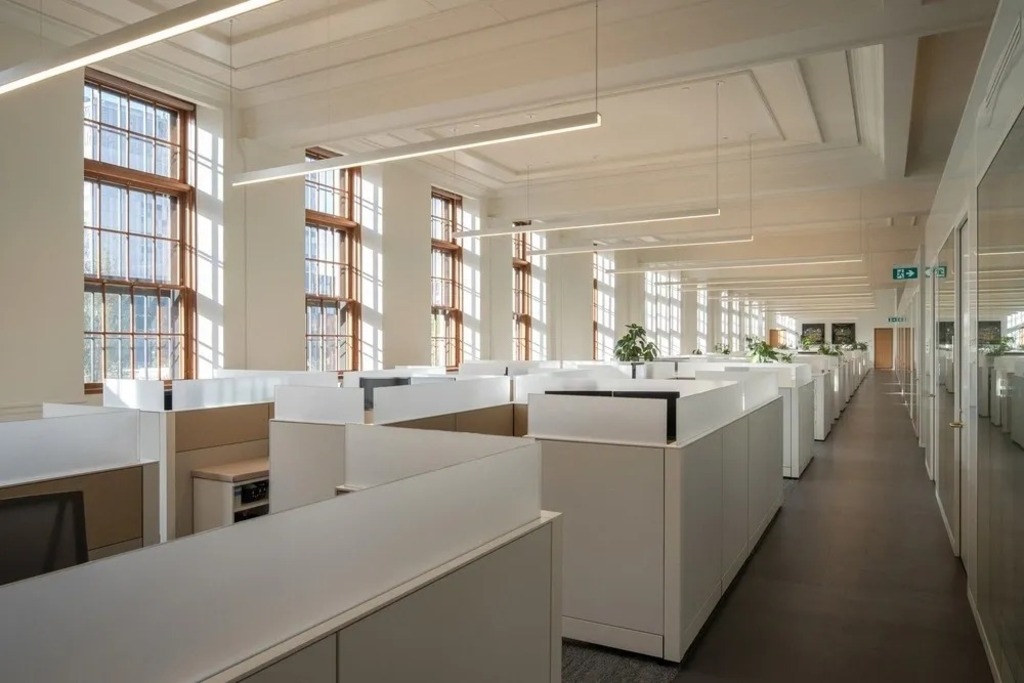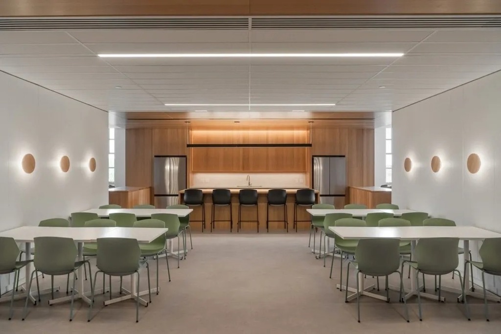 The upper floors, once dark and compartmentalized, have been transformed into bright, flexible work environments. Prioritizing natural light, acoustic comfort, biophilic design, and discreet technological integration, these new spaces support health and collaboration. Lessons from the COVID-19 pandemic informed new workplace configurations, introducing areas for focused work, informal gathering, digital communication, and rest.