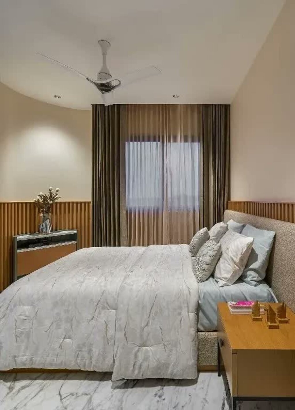 The first bedroom which belongs to the eldest son celebrates warmer umber wood tones in the form of a grooved accent wall with a soft grey upholstered headboard. The array of sleek metal shelving suspended across the room’s walls are meant to host the end user’s curios and memorabilia. The flannel curtains camouflage with the neutral walls, allowing the space to assume an expansive look and feel. Tones of blue and hints of red make their debut in the form of upholstery and fabric to add a pop of colour to the bedroom. The bathroom of this bedroom witnesses the amalgamation of matte natural grey stone, marble and veneered surfaces that imbue it with a sense of understated luxury.