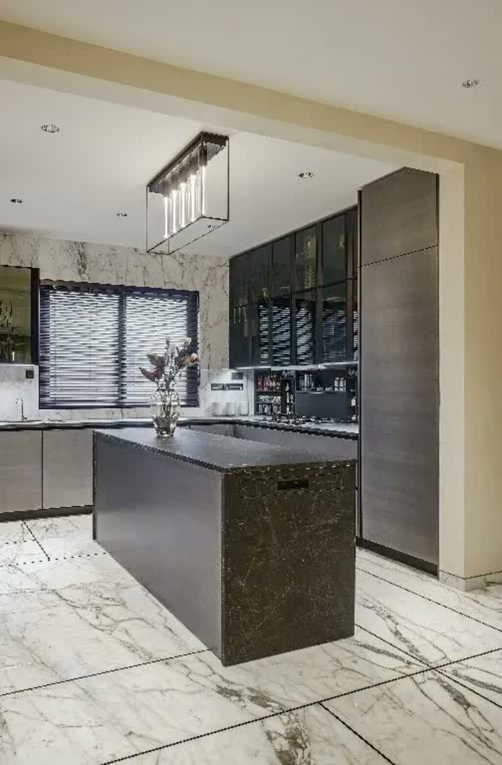 The condominium’s kitchen emphasises the functionality facet. Laminam stone and metallic lacquer frames in triangular-edge profiles render the space in a modern light. The monochrome and geometric flooring carry through into the shared spaces — a canvas of statuario marble that engages geometric play via black inlay work to form rectilinear sections.