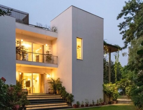 The ubiquitous and restrained materials utilized across the home create an uninterrupted canvas of sorts, thereby visually amplifying the spaces’ spatial volume. Doused in neutral tones, the living area hosts doses of earthy hues. The lime plaster-coated walls introduce a sense of amplified dimension via the grooves carried through the flooring pattern.