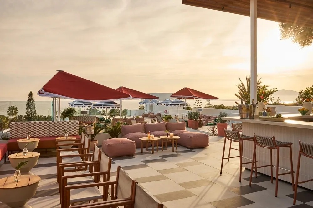 On the rooftop, Escondido offers a layered, cinematic experience. Platforms at varied heights define different zones, with the upper terrace hosting a glamorous ‘70s-inspired bar dressed in terracotta and bold geometric motifs. The lower terrace extends toward sweeping sea views, featuring a pool lined with retro tiles that shimmer under the Andalusian sun. By day, the space evokes laid-back leisure; by night, it transforms into a sophisticated, glowing panorama of retro glamour and coastal charm.