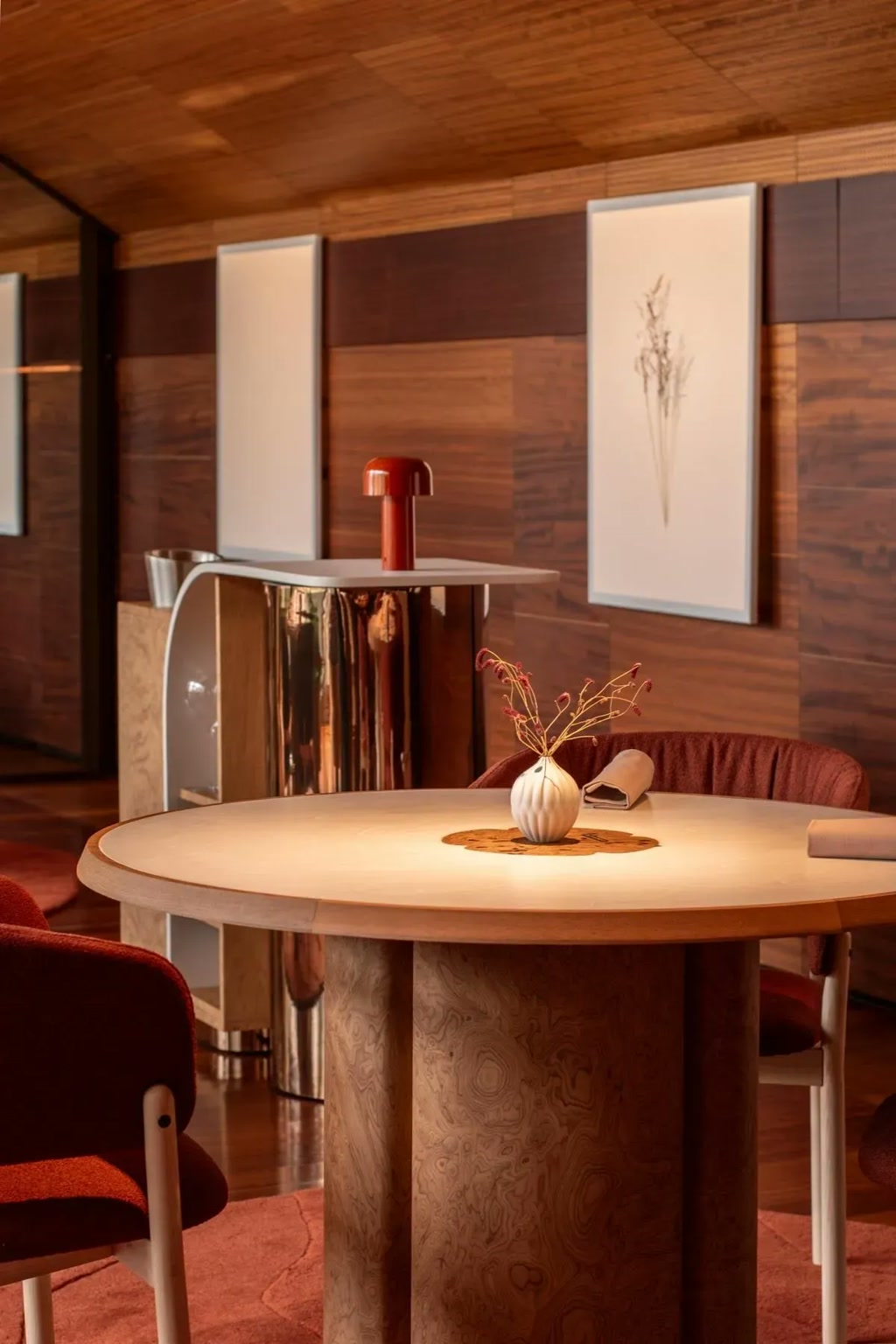 than decoration, the design focuses on orchestration. The project is conceived as a system in which architecture, art, and gastronomy operate in parallel. Integrated artworks function as narrative devices, contributing to the experience without visual excess. The spatial sequence begins at the reception, introduced by a bespoke furniture element, before transitioning through the wine cellar as an initial sensory threshold. The dining room unfolds around a central chef’s bar, positioning the diner as an engaged observer within the culinary process.