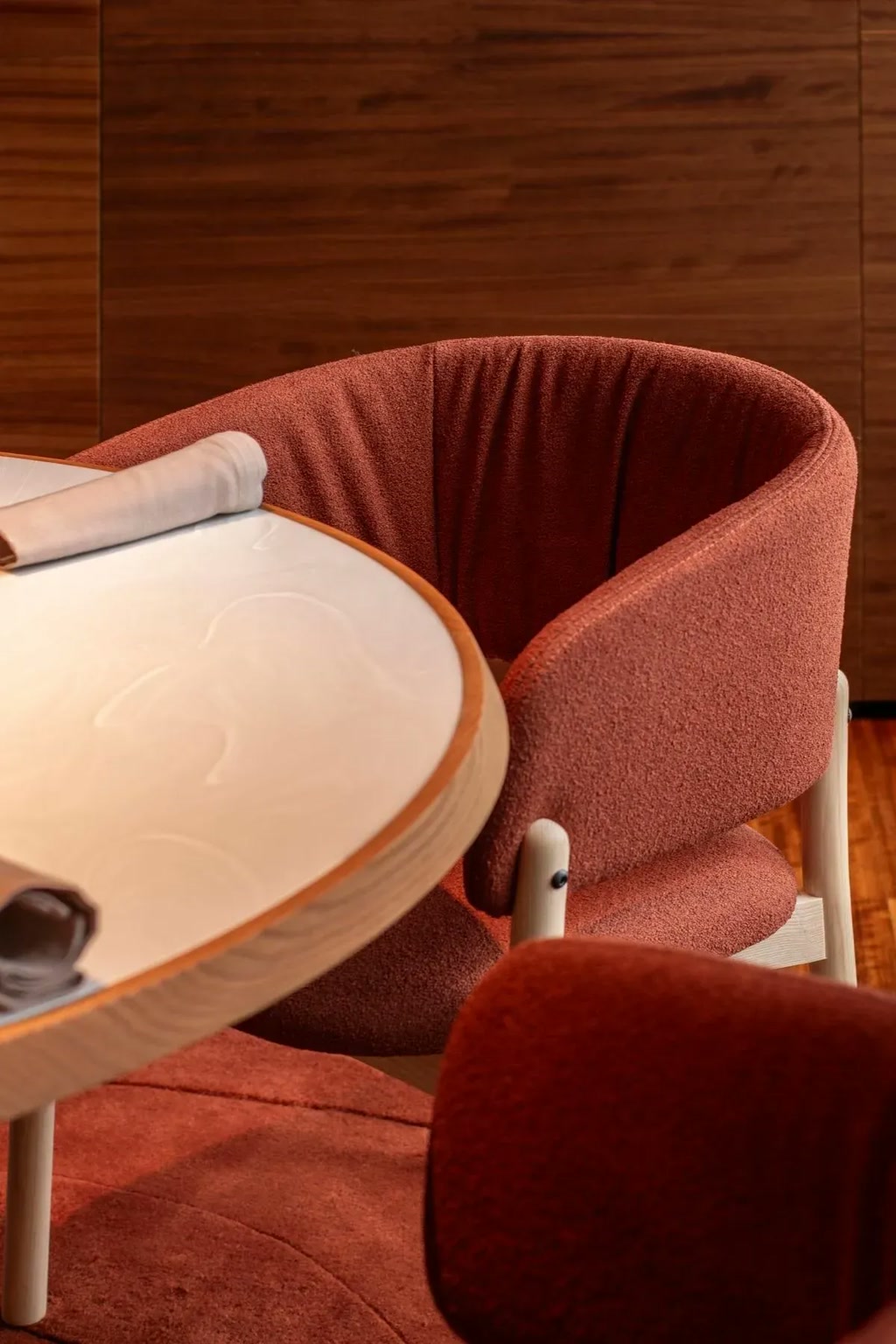 rounded forms soften the rigidity of the existing architectural shell, while acoustic comfort is achieved without structural modification. Rugs within dining areas and vertical textile elements absorb sound and refine environmental performance, ensuring comfort within an open-plan setting. With the exception of seating and exterior furnishings, all elements have been custom-designed. Tables are conceived as functional instruments rather than decorative objects, eliminating the need for tablecloths and reinforcing the precision of the dining experience.
