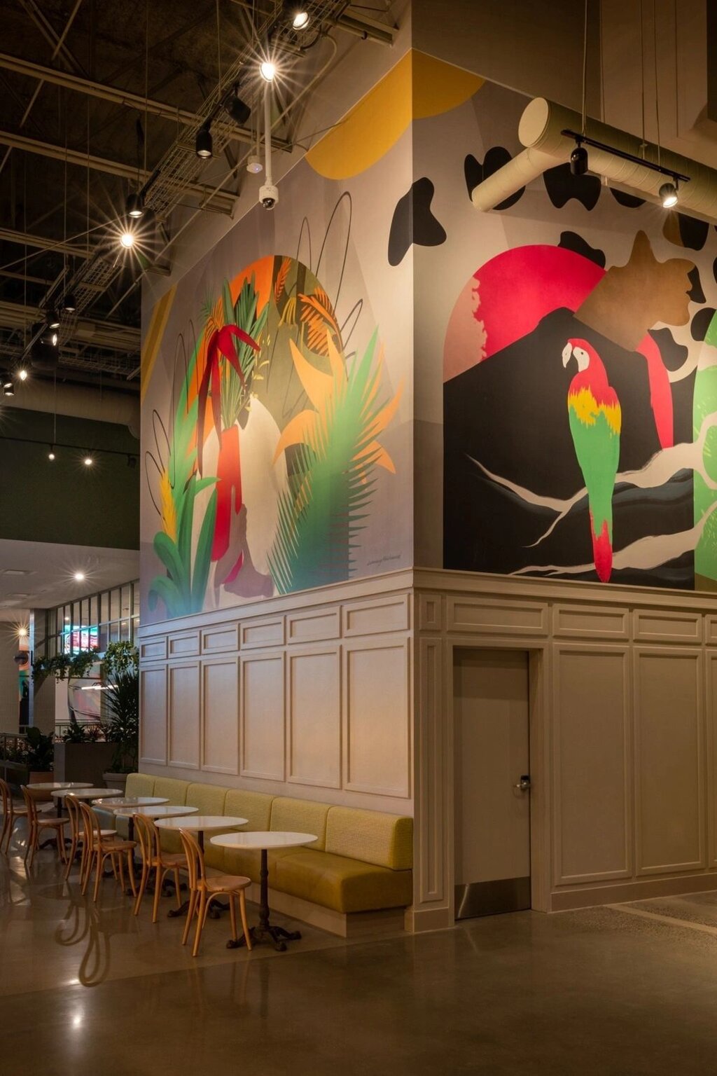 The mural’s patterns feature surreal elements and subtle touches of jungle vegetation, blending seamlessly into the environment while drawing attention through their originality. Designed to reveal itself gradually, the mural offers new perspectives with each visit, serving as a starting point for imagination and reflection. The mural also plays a crucial role in transitioning between the two atmospheres of the space. The design is divided into two large sections, each representing one of these phases, highlighted by a carefully chosen color palette that allows for visual fluidity linking the two moods. The contrast between dark and light tones creates depth and visual richness that captivates the eye and invites discovery.