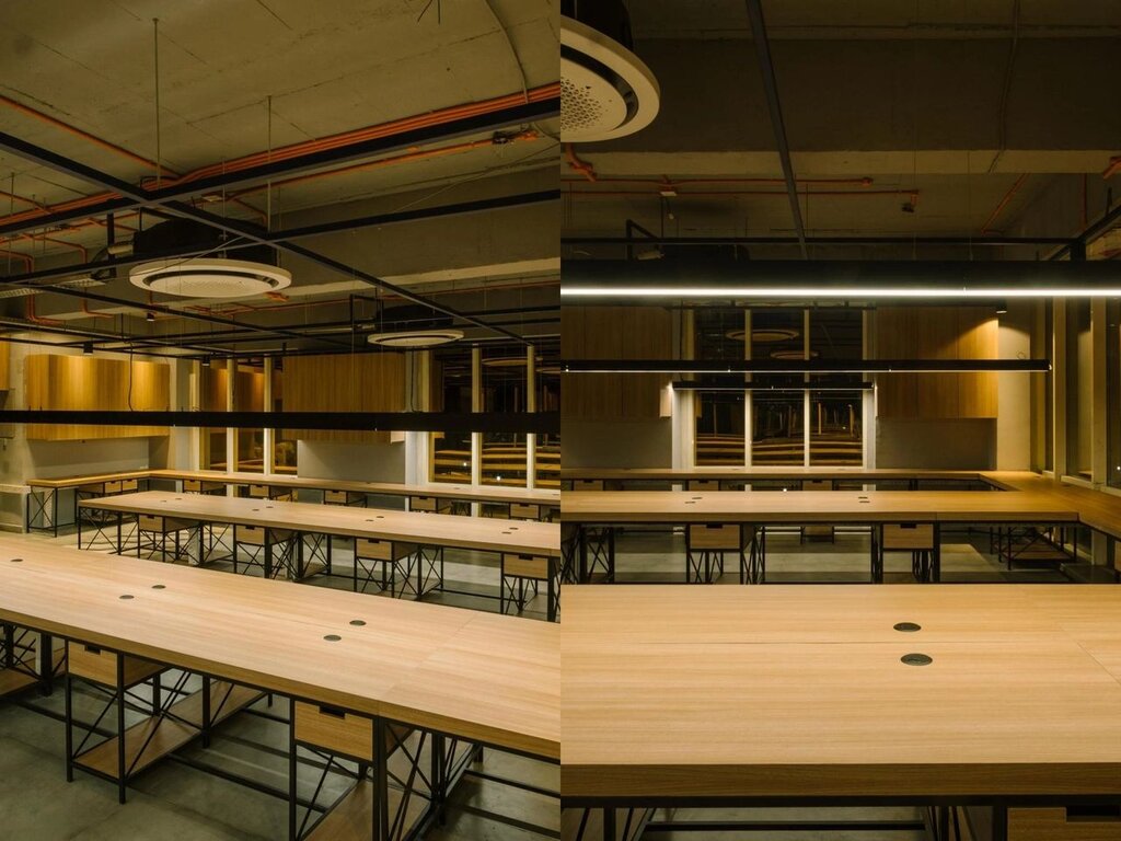 Concrete flooring paired with an exposed ceiling brings cohesiveness to the space, while a suspended metal grid framework integrates the lighting system. Lighting plays a crucial role in this design, with a blend of natural light and a combination of suspended and surface-mounted lights creating a layered and efficient environment. The natural light, managed by blinds to control glare, not only makes the space appear larger but also infuses it with positive energy.