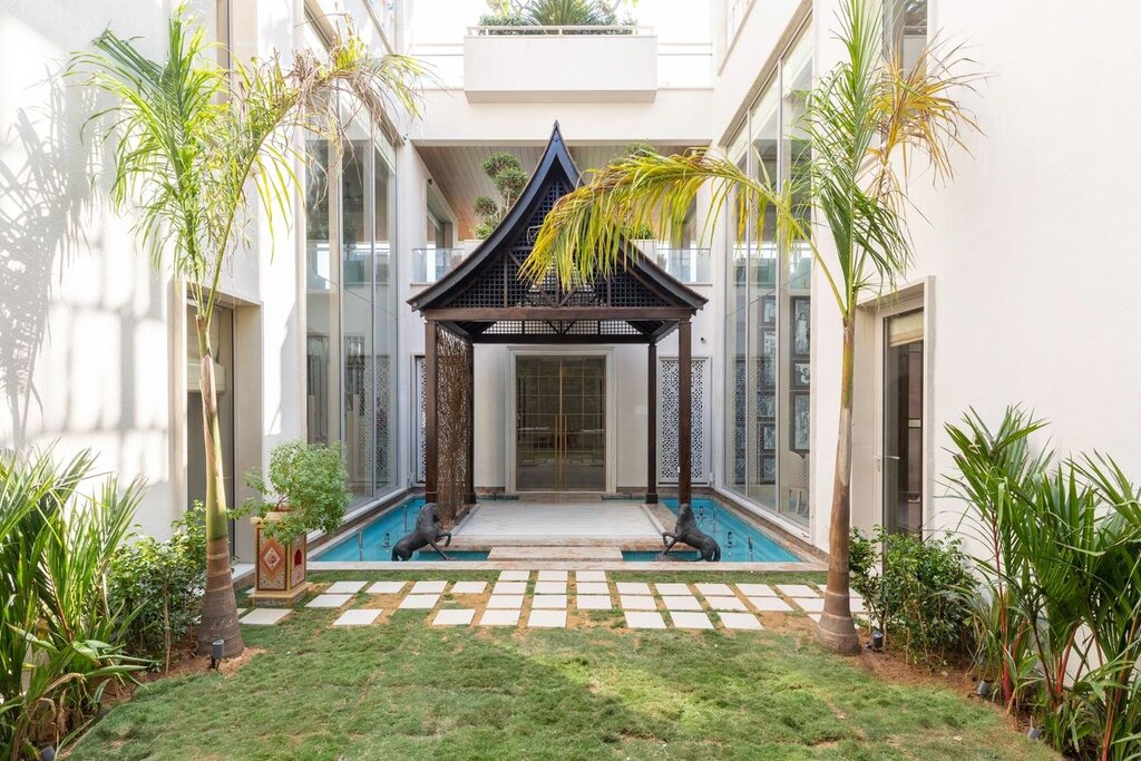 The Twin Residence in Jaipur is a remarkable 7,800 square-foot architectural marvel, crafted by Rajkumar Architects . This ambitious project emerged from the vision of two brothers who dreamed of creating a home that symbolizes unity and tranquility for their families. At its heart is a twin house design, centered around a central courtyard that strengthens and deepens their familial bonds.
