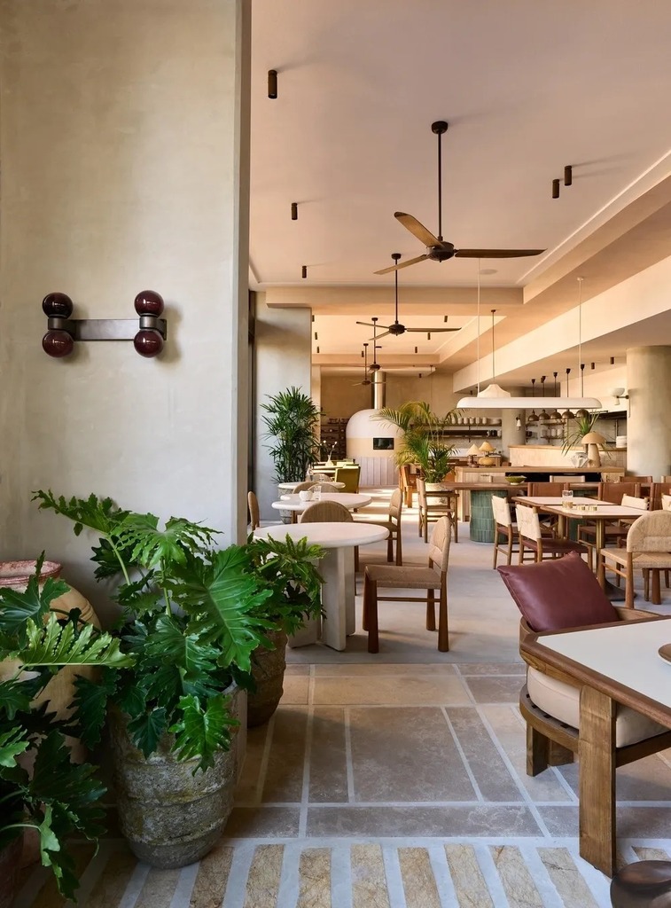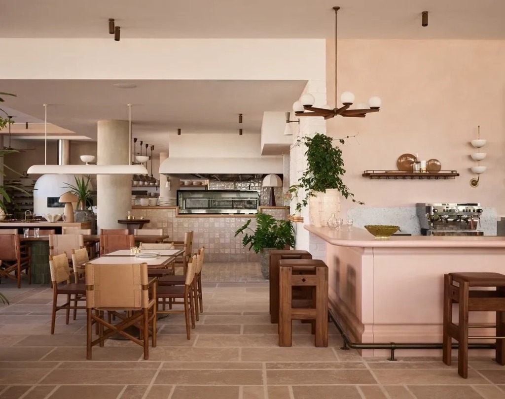 A pre-cast concrete bar with mirrored surfaces reflects the pool deck, while the dining area combines timber, patterned tiles, and a seafood counter for a lively, communal feel. Custom brass and cream lighting by Transmitt animates the stone-heavy interiors, while timber furniture with leather accents evokes understated luxury.