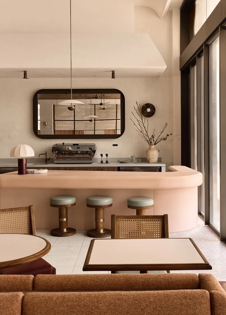 A central open kitchen, long bar, and cafe corner animate the venue throughout the day – from morning coffee runs to evening dining. The design reconciles multiple flows: street-side patrons seeking grab-and-go, community diners, and hotel guests arriving at reception.