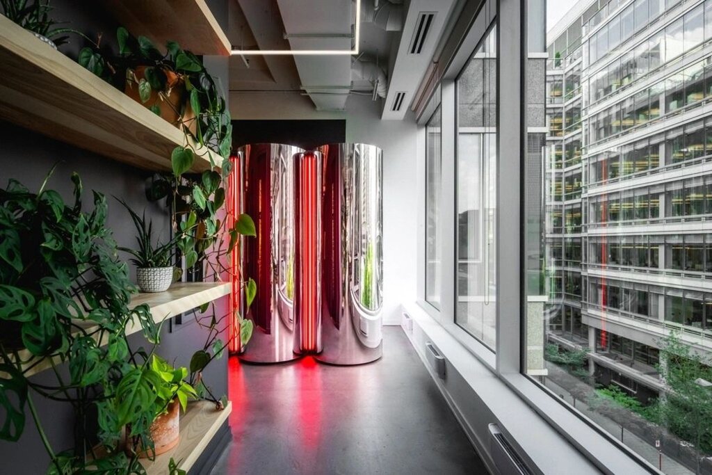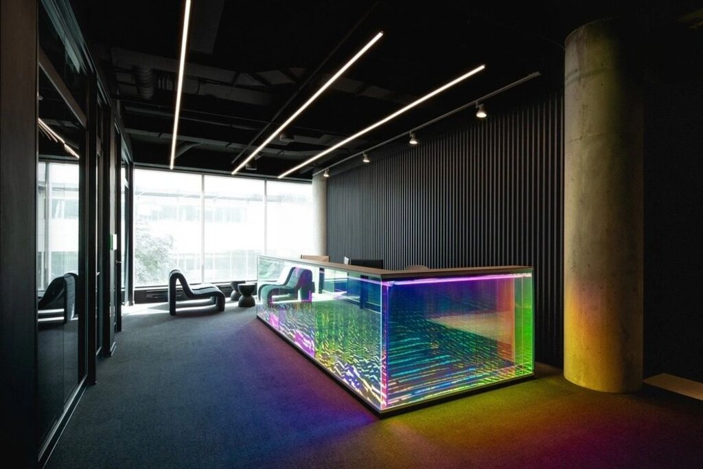 Upon entering, visitors are greeted by a striking reception desk wrapped in a dichroic and mirrored finish. This unique design element shifts in color depending on the viewer’s angle, serving as a subtle homage to Plus Company’s vibrant logo and inclusive culture.
